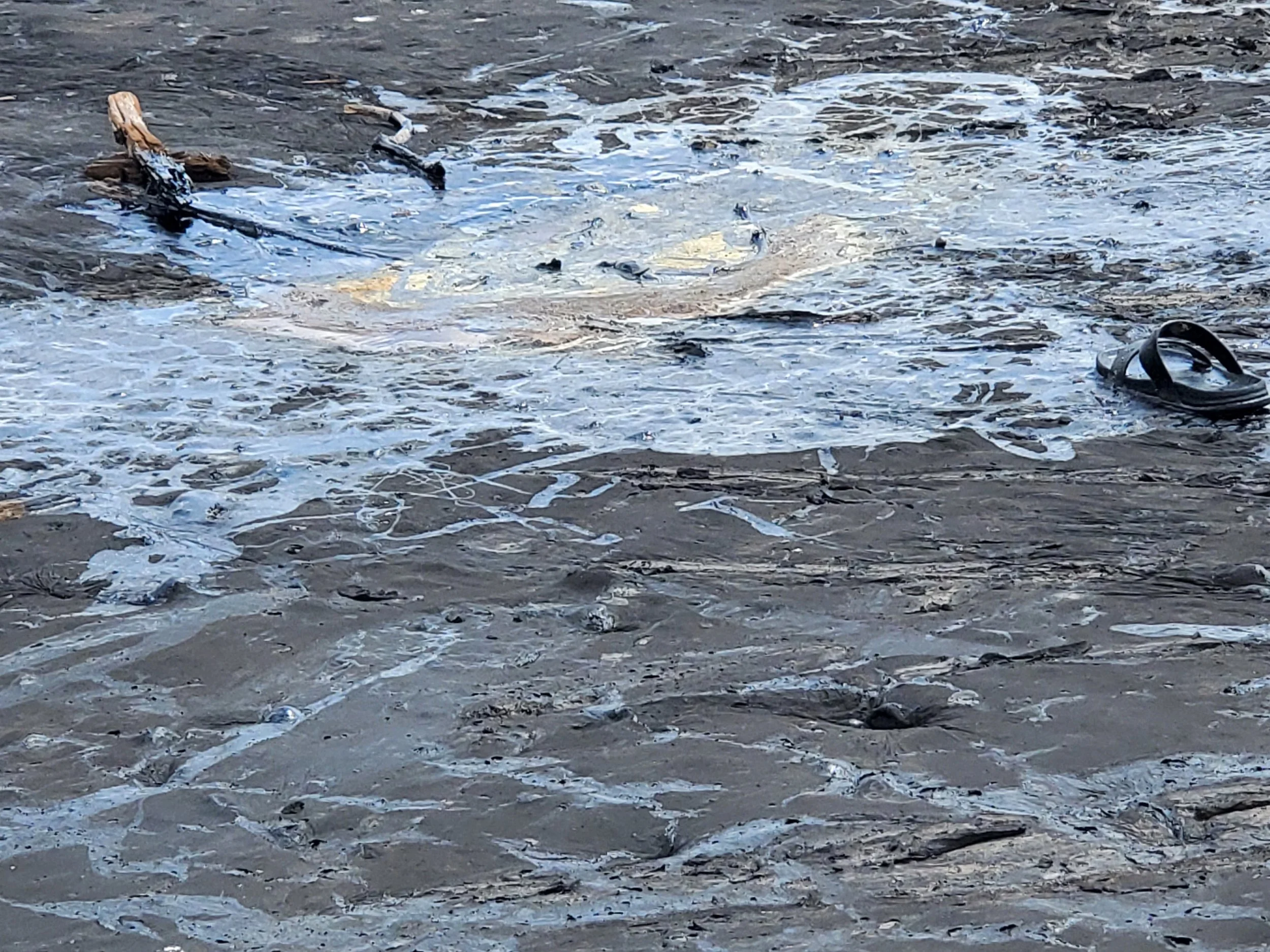 Going to the lake without an experienced tour guide can be dangerous as is evidenced by a sandal stuck in the pitch.